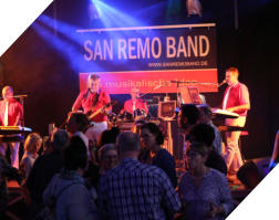 Mit guter Laune und Musik unterschiedlichster Stilrichtungen bringen wir alles mit für eine zünftige und gelungene Party. Wir feiern mit Euch bei fetziger Partymusik in unserem typischen SanRemoBand-Sound. Nicht der Computer beherrscht das Fest sondern Armin, Hans-Dieter, Heinz und Manne beherrschen die Instrumente Akkordeon, Keyboard, Gitarre, Bass und Schlagzeug. Zusammen mit mehrstimmigem Gesang sind gute Stimmung und Feierlaune garantiert.